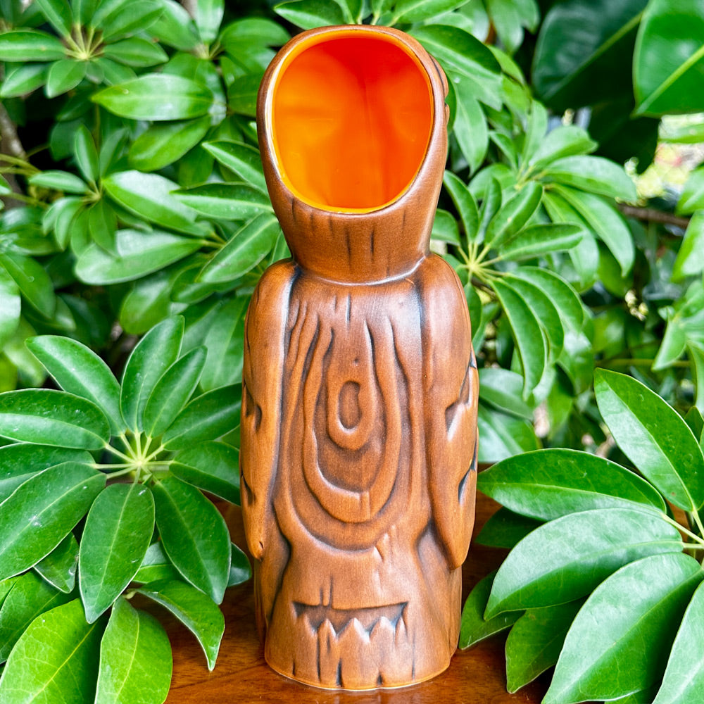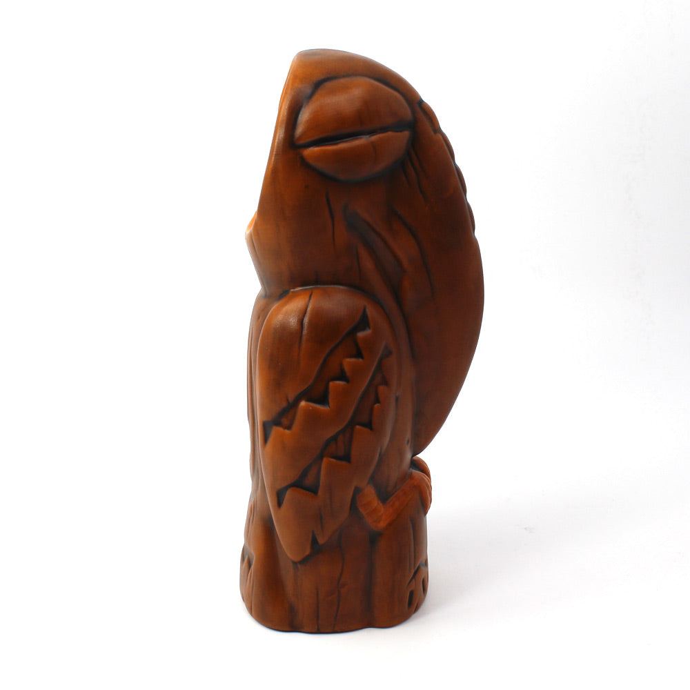 Glazed in a charcoal washed, warm, wooden brown primary finish, the Ghost Bird Mug features intricate carved details on its wings, beak, and orange-tone talons, evoking both Papua New Guinea tribal art and native-carved totems. The tall, slender form makes it perfect for showcasing exotic cocktails, while the sculptural silhouette doubles as a striking piece of art to proudly display.