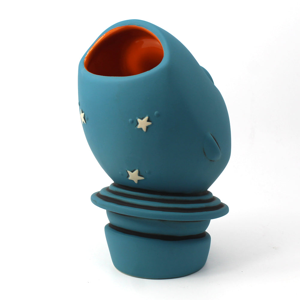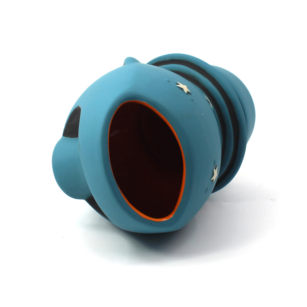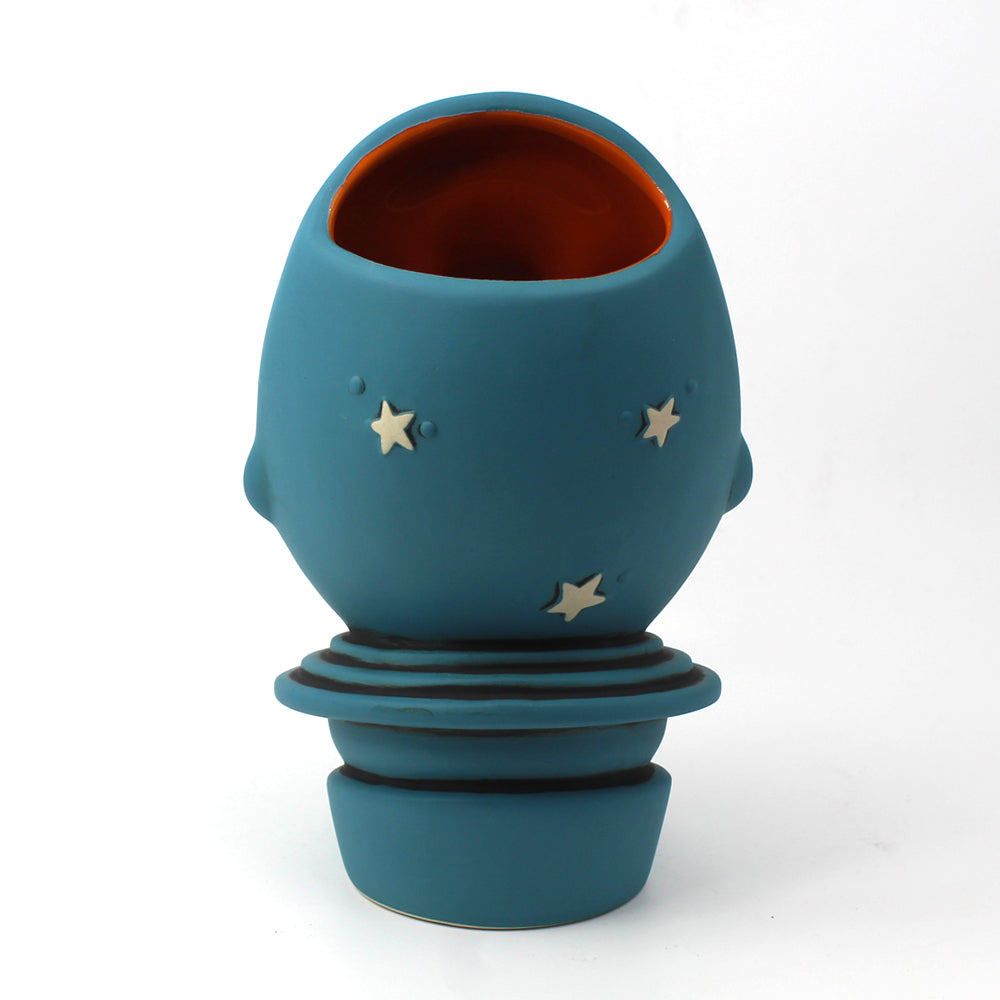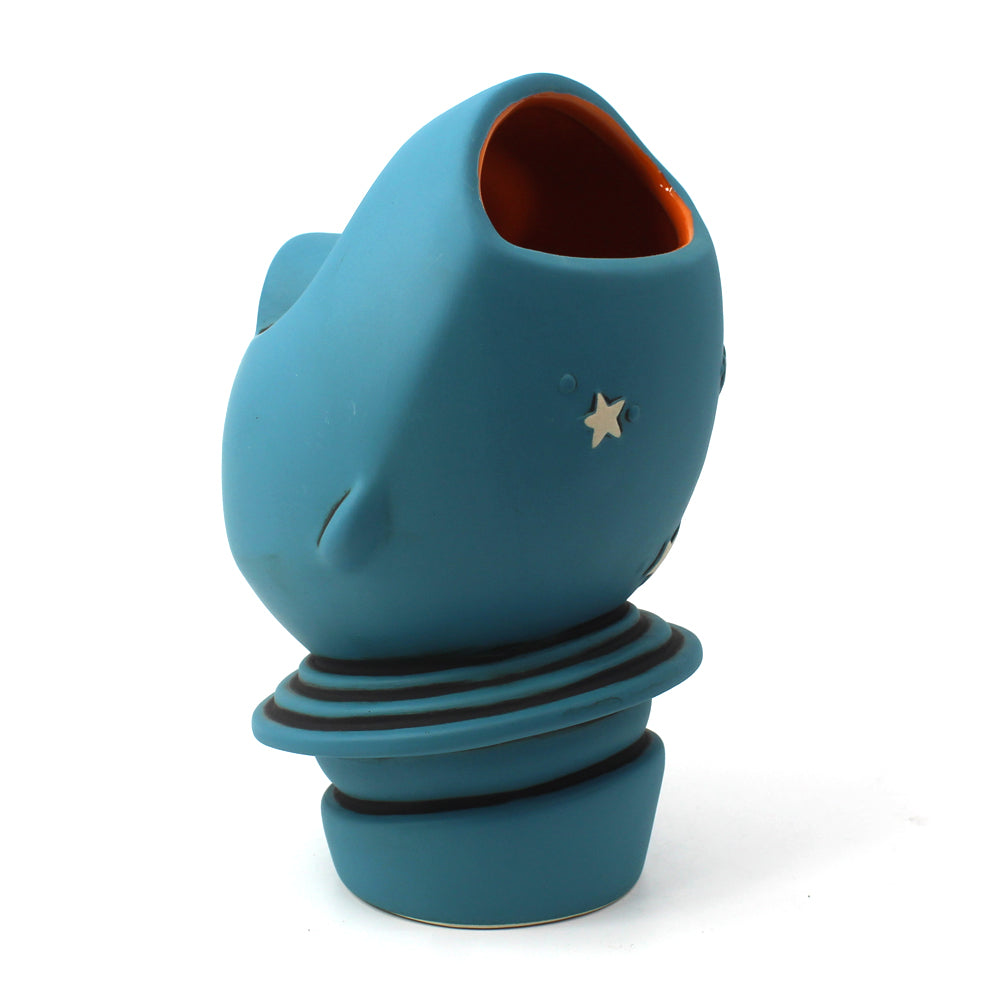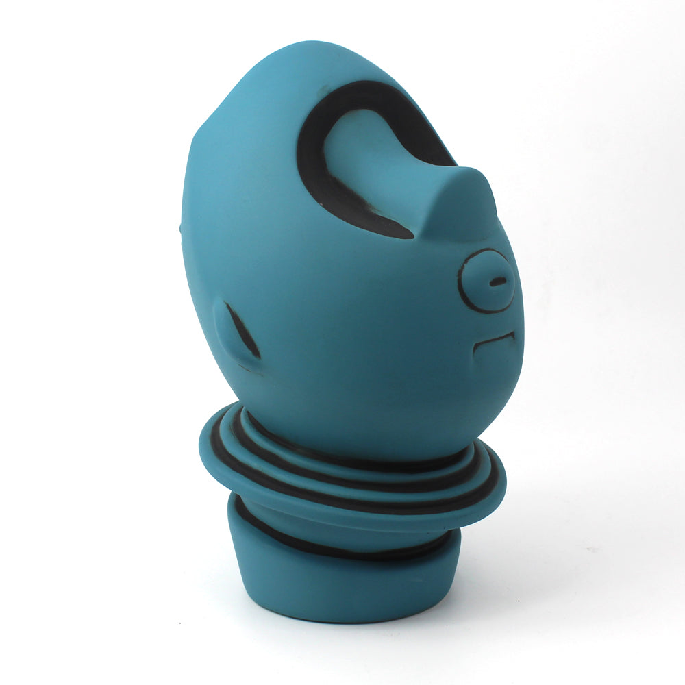 The “Saturn rings” and a space-forward take on an Easter Island Moai meld into this wonderful, kinda-alienesque little fellow! Glazed up in an early-evening blue-sky inspired vibe with a black wash and recessed facial features, you’ll also find distant stars and planets on the obverse.